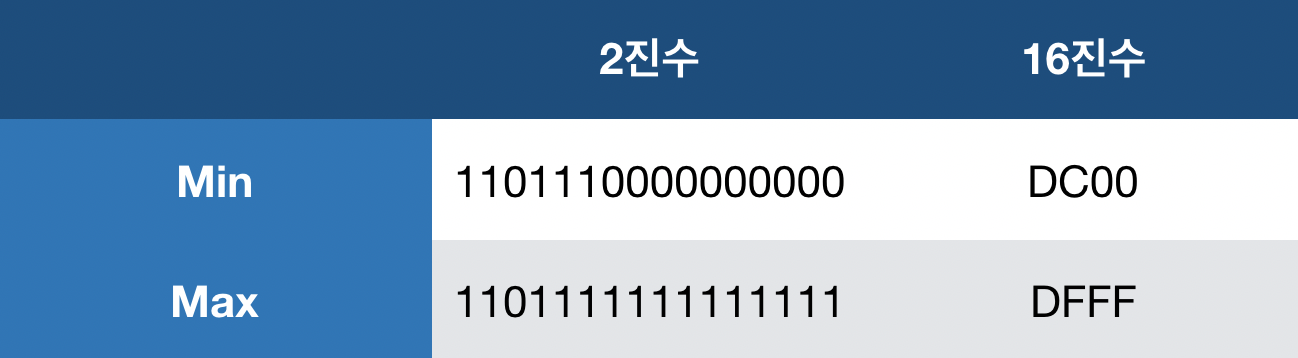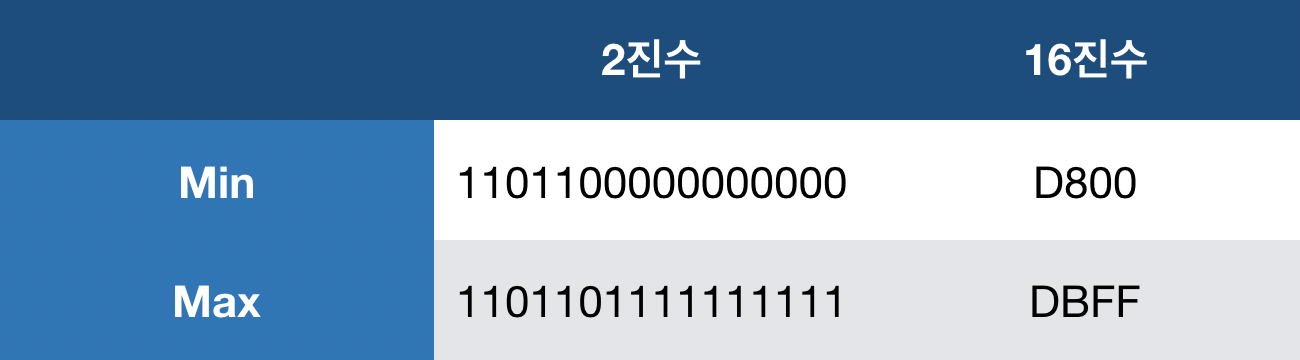 : Surrogate는, 미래를 위해 Code Point에서 따로 남겨둔 부분이다(Surrogate 개개별로는 Character로 나타내지 않는다). 범위에 따라 High Surrogate와 Low Surrogate로 나뉘어 진다. High Surrogate와 Low Surrogate는 범위가 다른데, 표로 나타내면 다음과 같다.